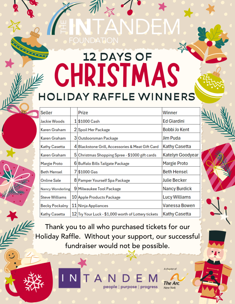 Thank you to everyone who supported the 2025 Intandem 12 Days of Christmas Raffle. Your participation helped advance our mission of serving people with all abilities across WNY, and we are grateful for your generosity.