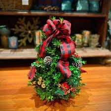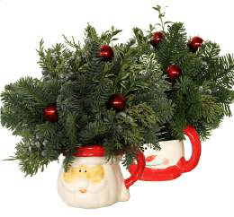 Fresh evergreens arrangements in decorative holiday themed planters complete with seasonal decorations and a beautiful ribbon bow; perfect for bringing the smell and cheer of the holidays into any room.