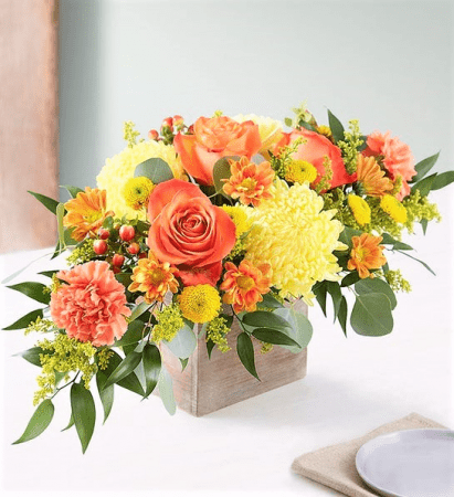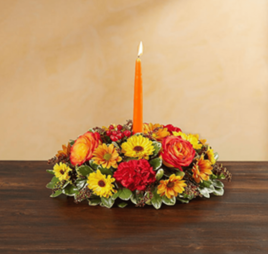 Bring warmth and gratitude to your table with rich autumn hues and natural textures. Our handcrafted arrangements pair holiday blooms with greenery and a candle for a cozy, inviting touch. Perfect for gathering around the heart of your home and celebrating moments of connection.