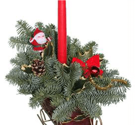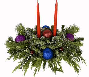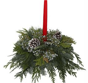 Beautiful arrangements filled with blooming cut holiday colored flowers, accented with assorted greenery, holiday decorations and finished with a candle.