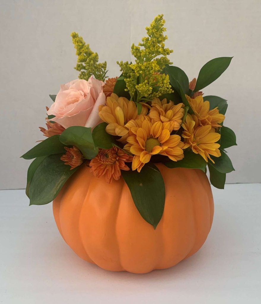 Filled with blooming autumn-colored cut flowers, assorted greenery & fall décor.